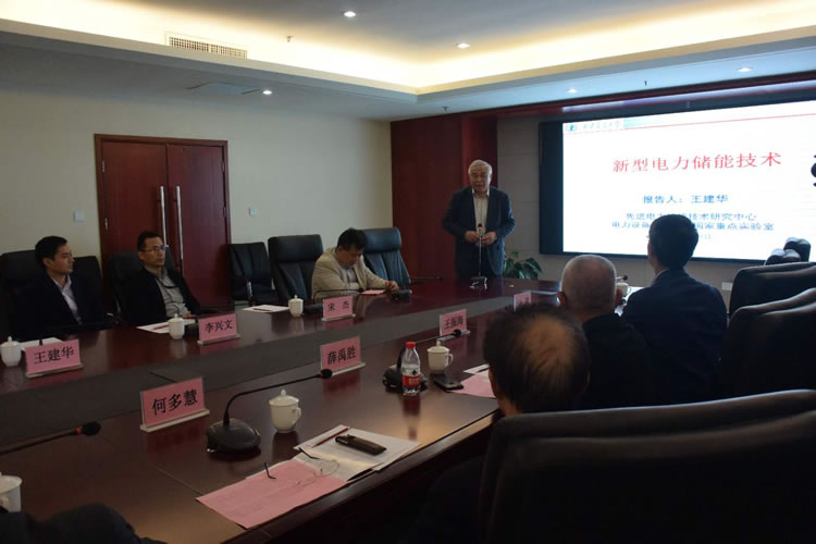 考察第一站是在西安交大科技园会议室听取王建华教授关于“先进储能技术项目”的报告。会议由西安交通大学副校长席光主持,张迈曾书记致欢迎辞。张书记首先感谢各位院士长期以来对西安交通大学的关心和支持,并简要介绍了西安交大的发展规划,特别是电气学院的实力和优势,希望院士团对西安交大电气学院和学科建设多提宝贵建议。随后由王建华教授作了“先进储能技术项目”的报告,他从储能技术的发展和大规模应用必将使电网结构发生革命性变化以及促进储能产业的高速发展的背景谈起,系统介绍了液态金属电池研发、高密度储氢研发及风光氢储微电网研发的进展,并就项目的初步成果及示范推进进行了说明,报告引起了与会院士的浓厚兴趣和高度关注。